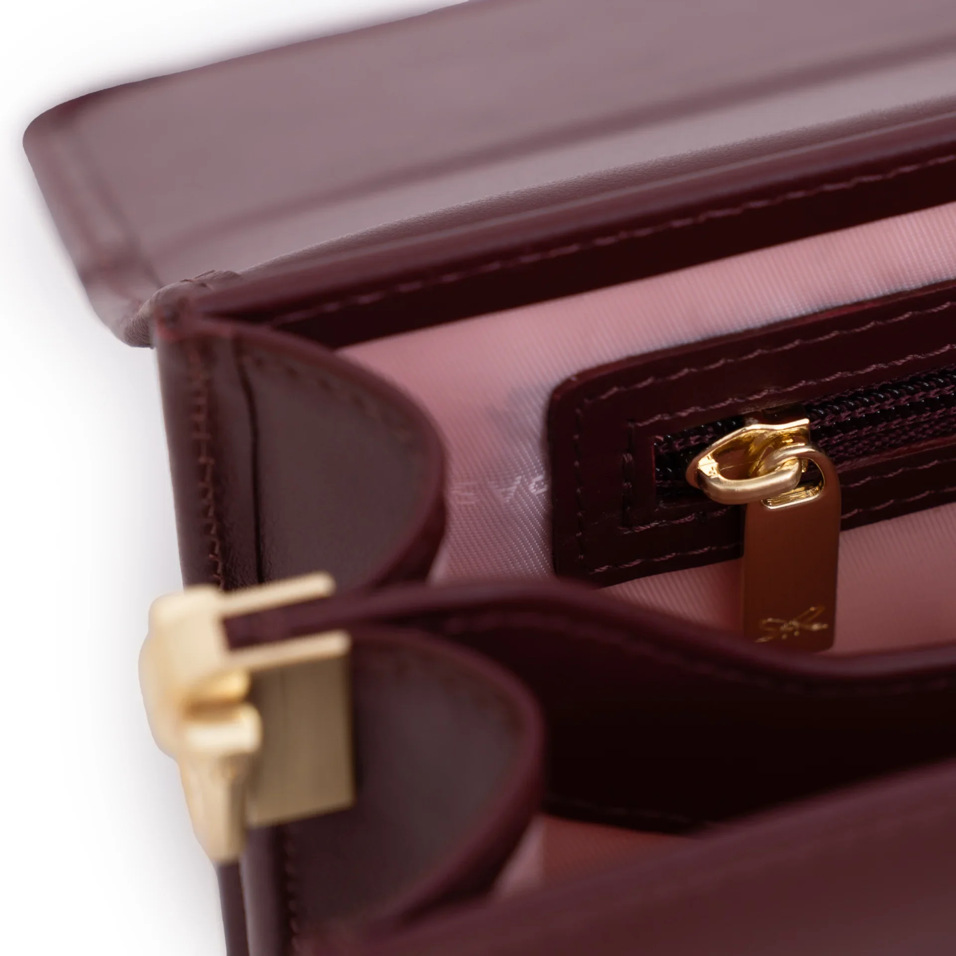 Wykończenie w środku: materiałowa podszewka w odcieniu pastelowo-różowym z logotypem marki